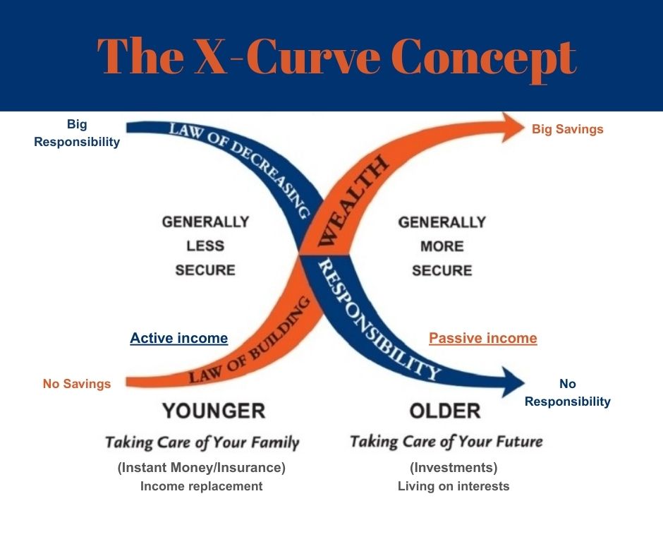 The X-Curve concept is an insightful framework designed to help individuals visualize and understand the complex interplay between their financial responsibilities and the accumulation process over their lives. This model posits that as a person’s financial obligations generally decrease over time, their wealth increases correspondingly. The resulting X-Curve consists of two distinct curves—one representing financial responsibilities and the other representing wealth—that move in opposite directions across different stages of life.